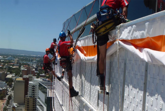 Промышленный альпинизм – специальная технология выполнения работ на высоте с использованием альпинистских методов доступа и страховки. Применительно к рекламной сфере под промышленным альпинизмом понимаются работы, выполняемые на высоте специалистами с использованием специальной техники с целью монтажа, демонтажа или обслуживания конструкций наружной рекламы.