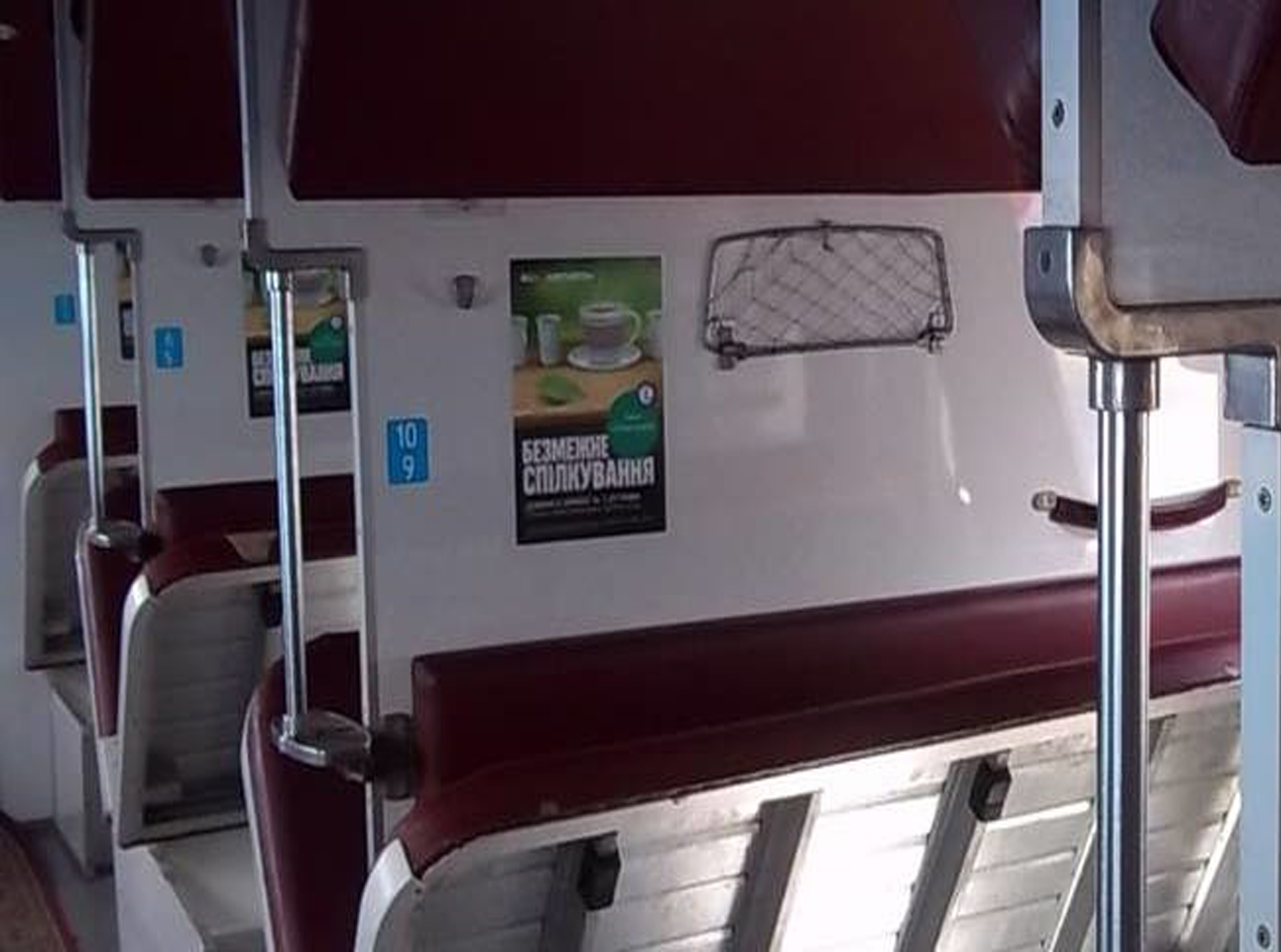Рекламные стикеры, плакаты в поездах на фото выше