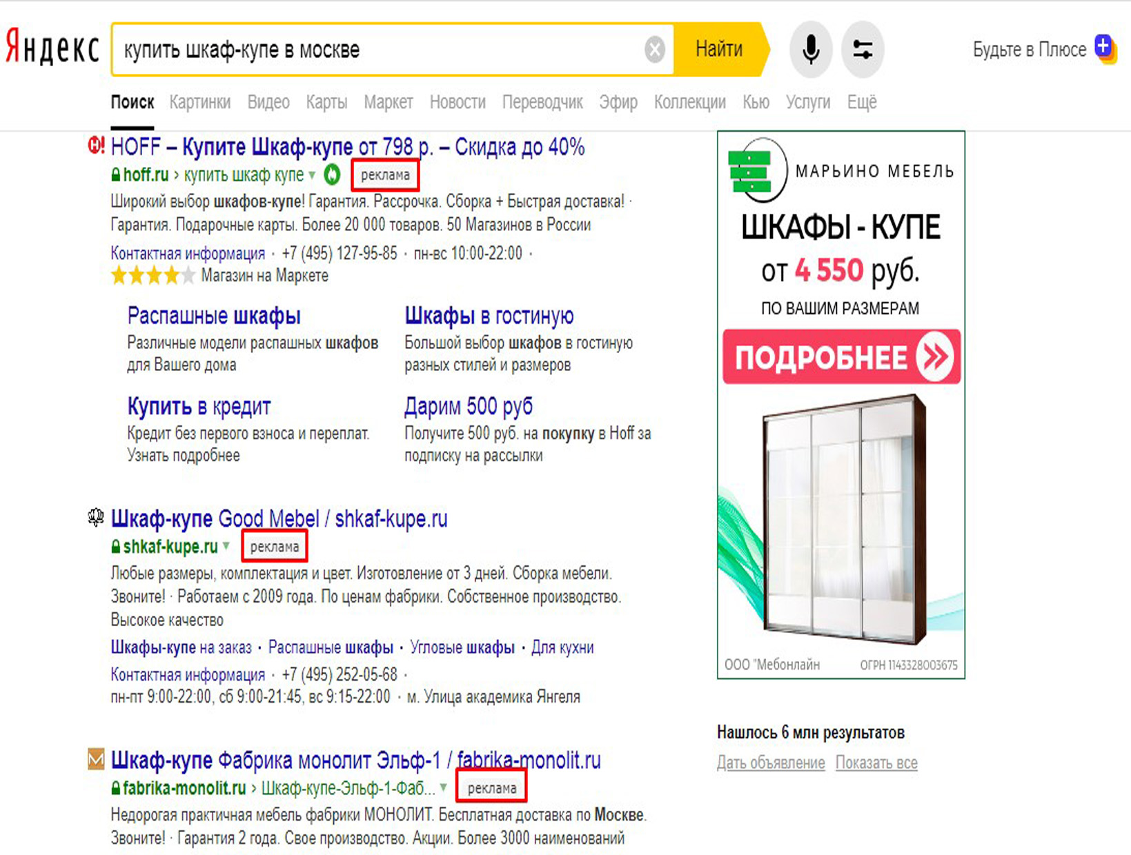 Пример текстовой рекламы в Яндексе представлен ниже: